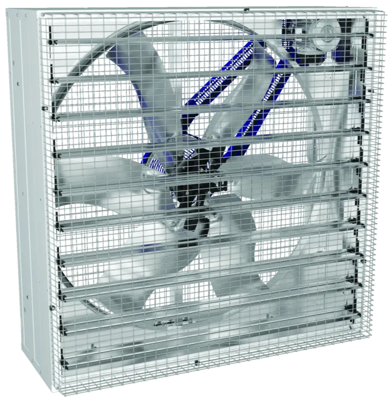 O sistema de acionamento por correia permite operação em baixa rotação, reduzindo significativamente o consumo de energia e o nível de ruído. Isso contribui para um ambiente mais confortável tanto para os animais quanto para os operadores, além de favorecer a eficiência do sistema de ventilação.